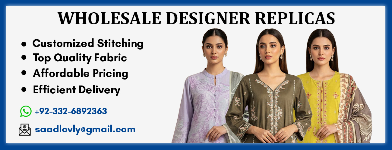 Welcome to the Wholesale Designer Replicas category at FaisalabadFabricStore.com — your trusted wholesale supplier for high-quality, ready-to-wear Pakistani replica suits. With more than a decade of experience and our own stitching factory, we bring you the most trending designer-inspired outfits stitched with premium finishing, perfect for resellers, boutiques, and online sellers.
