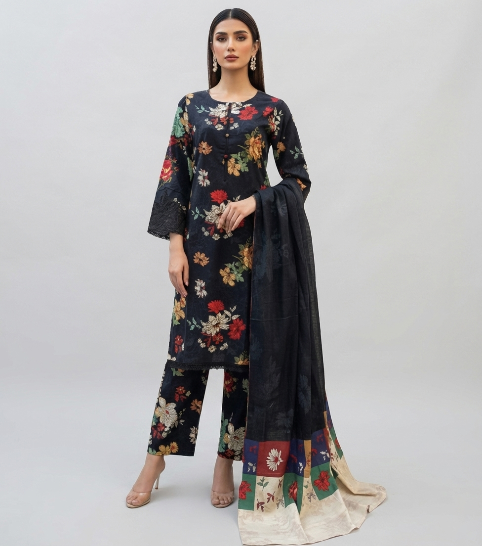 The Black Khaddar Wholesale Baroque Replica Dress is a perfect combination of elegance, comfort, and traditional charm. Crafted from premium-quality khaddar fabric, this 3-piece suit is winter-friendly, offering warmth without compromising on style. The rich black color with floral printed design adds sophistication and makes it suitable for both formal and semi-formal occasions.
