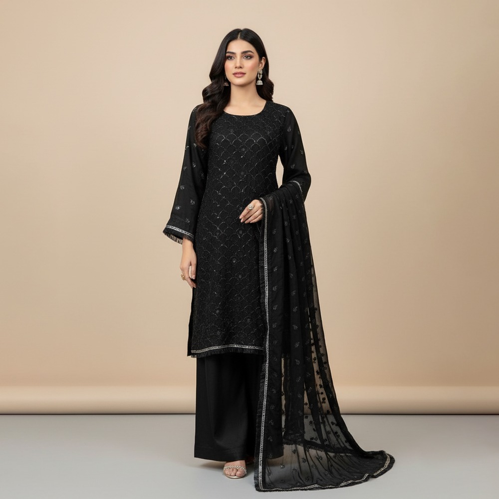 The Black Pakistani Chiffon Suit Wholesale is a timeless and elegant outfit designed for women who value sophistication and detailed craftsmanship. This high-quality 3-piece chiffon suit features a classic black color that adds depth, grace, and versatility, making it ideal for formal events, evening wear, and festive occasions.