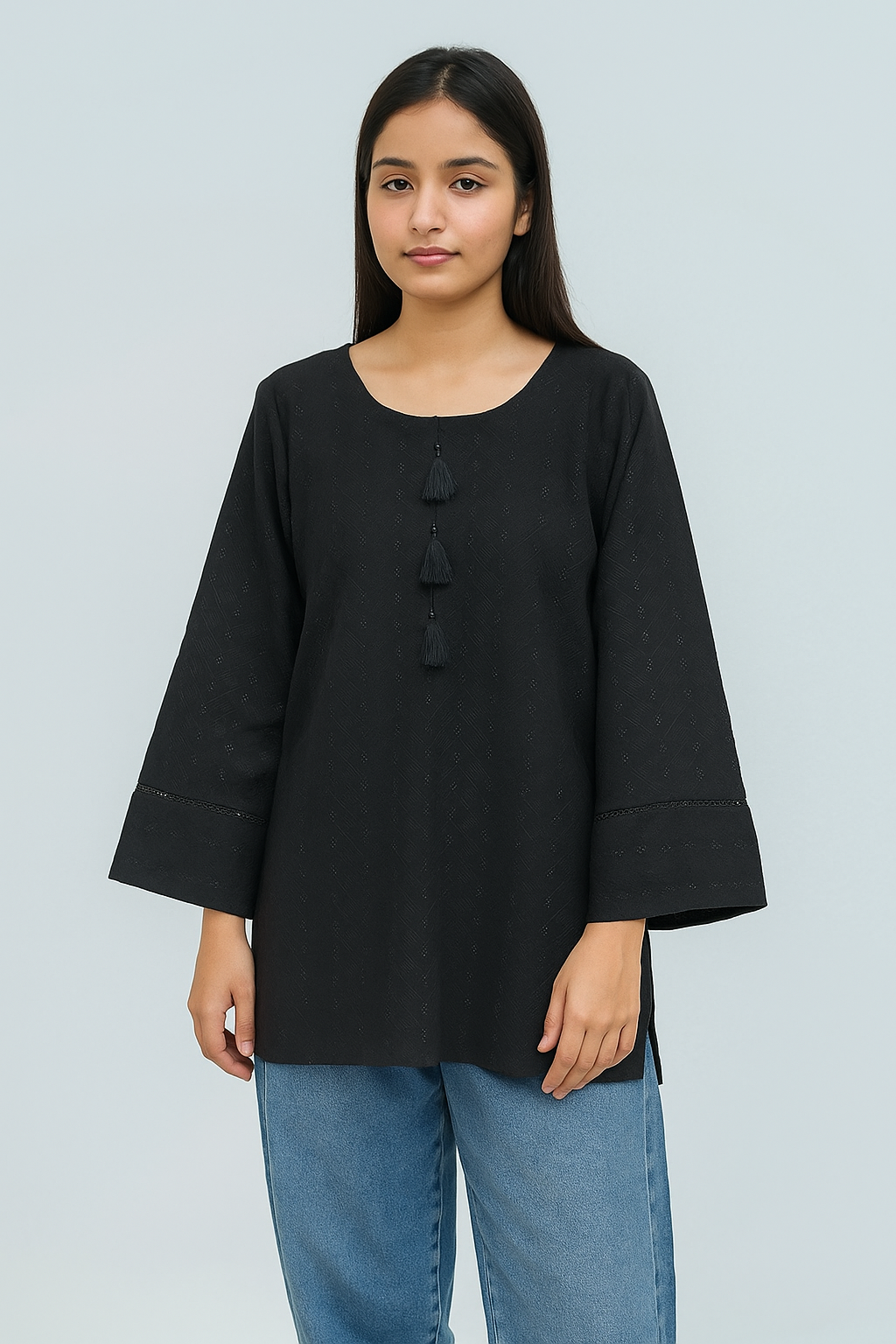 Designed in a short length with a trendy neckline, the kurti is finished with intricate lace embellishments and tassel details for added sophistication. Whether dressed up with tailored trousers or kept casual with jeans, this versatile piece offers endless styling options. Available in all sizes, it’s a must-have for UK shoppers who value elegance and quality.