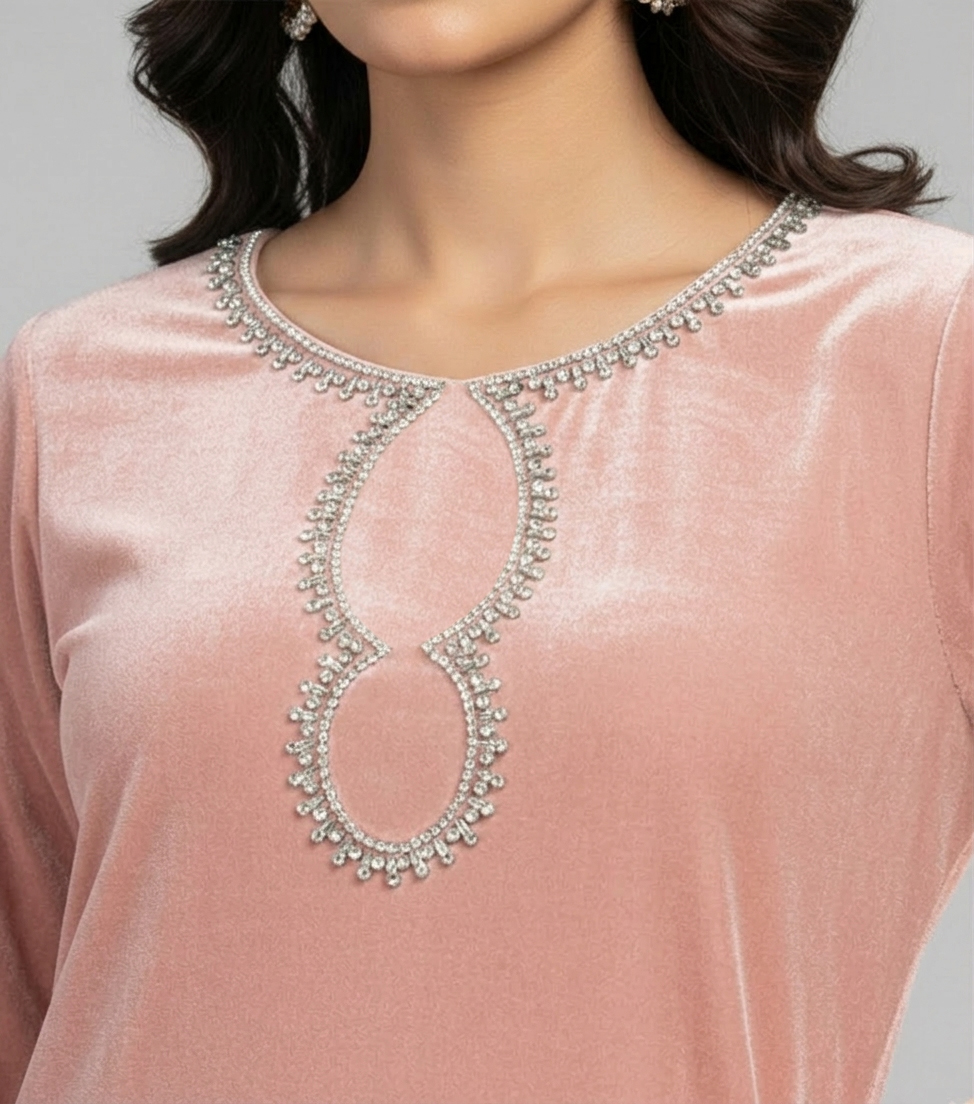 Crafted from premium plush velvet, the fabric offers a luxuriously soft texture while providing warmth and comfort during colder seasons. The rich velvet surface enhances the overall elegance of the outfit, giving it a refined and high-end look. Intricate handcraft detailing on the neckline and sleeves adds an artisanal touch, highlighting the craftsmanship behind the design.