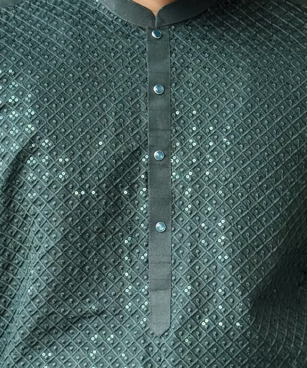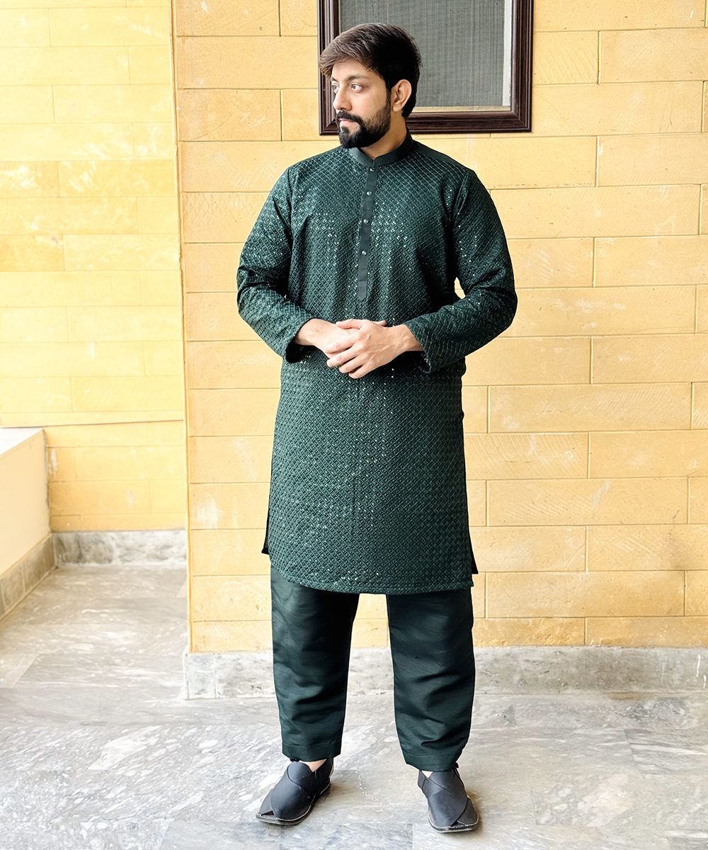This Dark Green Raw Silk Pakistani Men’s Kurta Pajama is a timeless piece that combines traditional craftsmanship with modern style. Whether you’re attending a formal event or celebrating a cultural festival, this outfit will make you stand out with its classy and refined appeal.