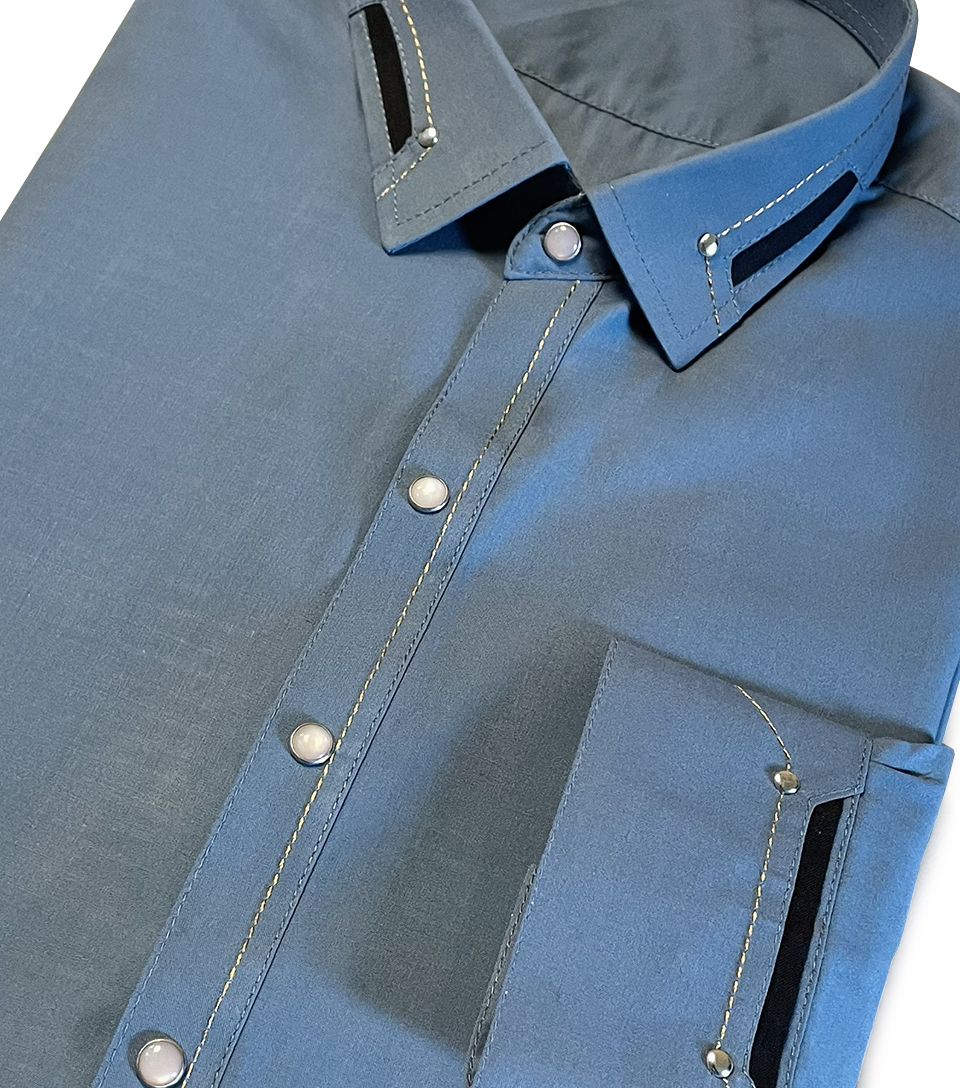 This design stands out with modern contrast accents, featuring dark horizontal strips along the collar and cuff edges. Fine, light-colored stitching along the placket, collar, and cuffs adds a refined detail, giving the outfit a polished, contemporary feel. The small metallic collar studs bring subtle elegance, while smooth, light-colored snap buttons offer a sleek contrast against the fabric.