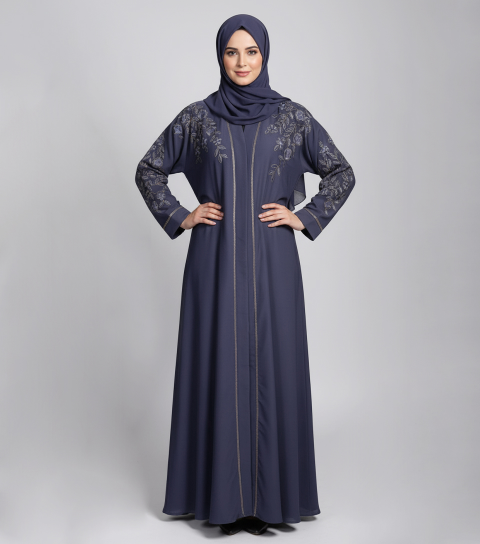 The beautiful embroidery detailing across the gown enhances its refined charm, while the wide flair silhouette adds a regal touch—perfect for both casual and formal occasions. Its rich dark grey shade complements every complexion, offering a timeless appeal that never goes out of style. The abaya is meticulously stitched in high-quality Korean nida fabric, ensuring long-lasting durability with an effortless flow.