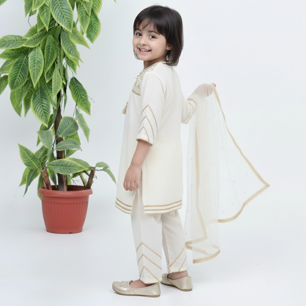 A sheer gold-edged dupatta completes the outfit, adding an extra layer of elegance and style. Designed for comfort and festive appeal, this two-piece set is perfect for children to move freely while looking stylish.