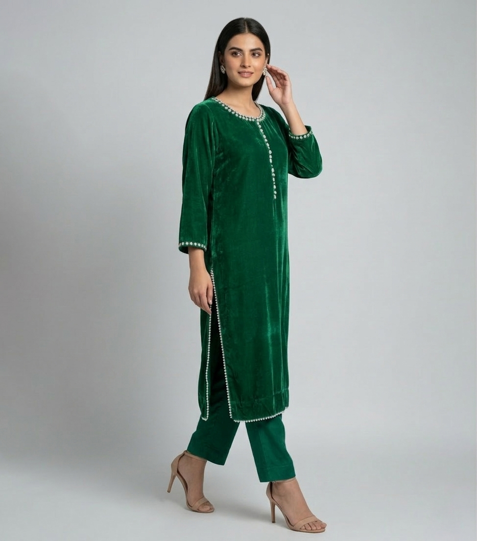 Crafted from premium plush velvet, the fabric offers a soft, smooth texture that feels comfortable while maintaining a luxurious appearance. The highlight of this outfit is the intricate handcrafted detailing on the neckline and sleeves, which adds a unique and elegant touch to the design. These carefully crafted elements enhance the overall look and give the suit a premium designer-inspired finish.