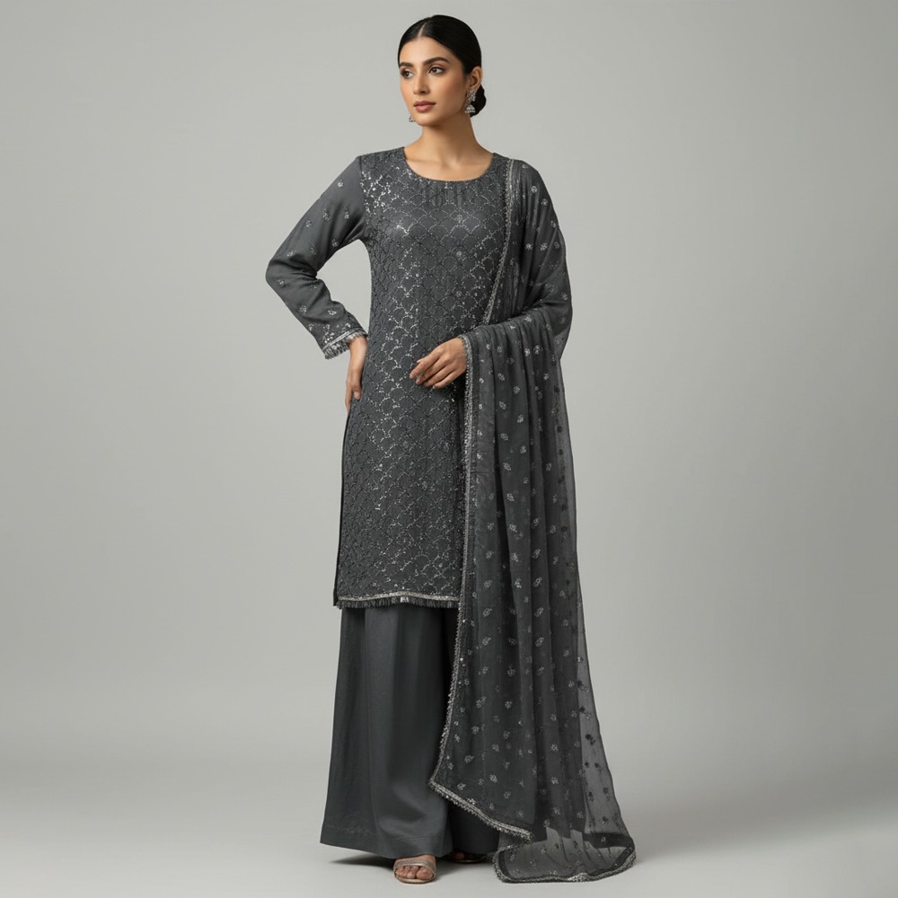 Perfect for boutiques and retailers, the Dark Grey Pakistani Chiffon Suit Wholesale delivers high-quality craftsmanship, elegant styling, and strong appeal for customers seeking premium chiffon outfits.