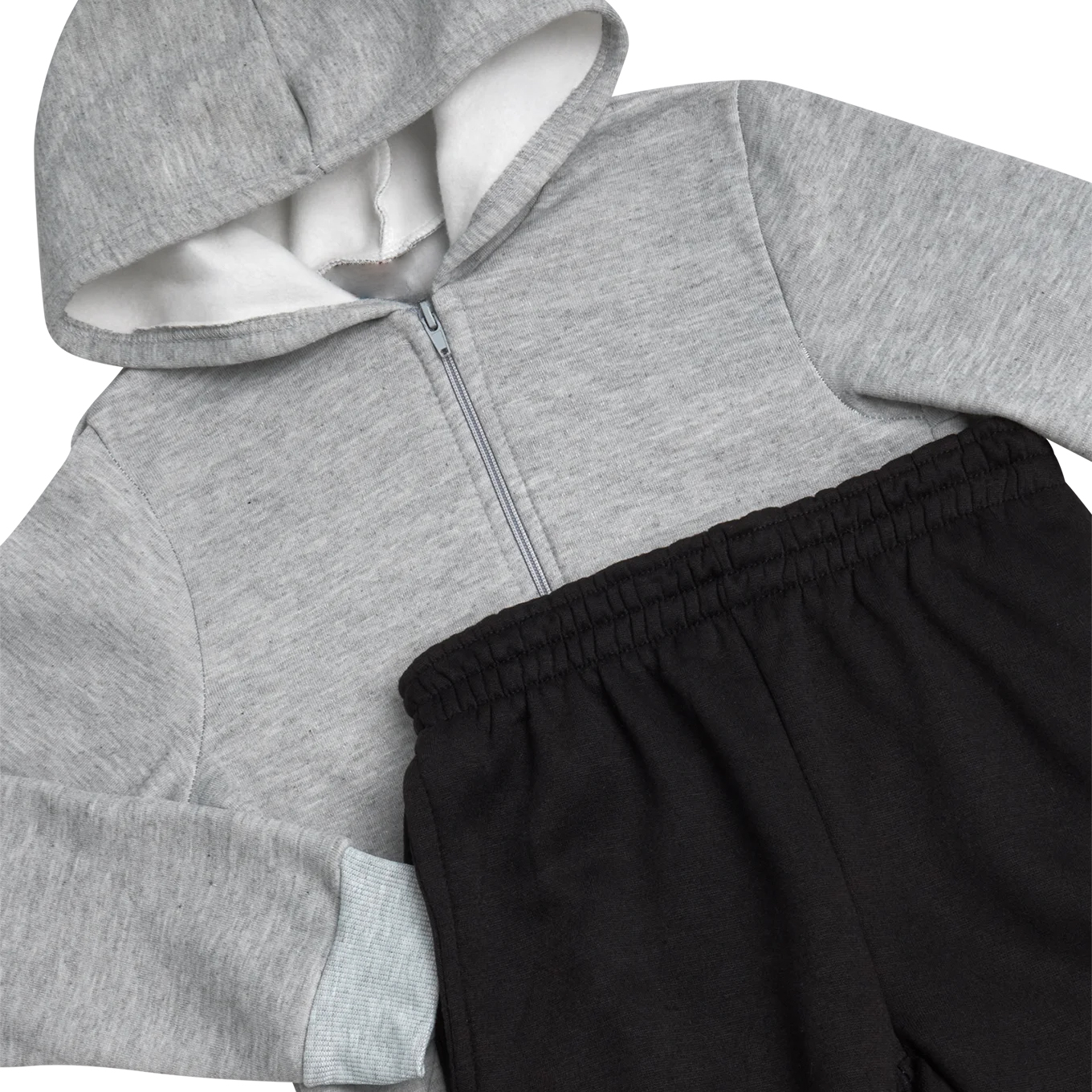 The jogger features two convenient trouser pockets, while the hoodie comes with a kangaroo pocket for easy storage. Adjustable drawstrings on the hood and trousers allow for a customizable fit. The Heather Grey – Black Wholesale Jogger Set is perfect for individuals or bulk buyers seeking quality and style in every piece.