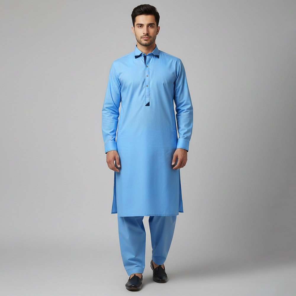 Dark navy accents on the collar, pocket flap, and cuffs give this Light Blue wholesale mens Shalwar Kameez an elevated finish without being too bold. Accent stitching along the placket and trims enhances its overall design, offering a neat, premium appearance. Durable buttons complete the look and ensure longevity. The included matching light blue shalwar keeps the outfit cohesive and classic.