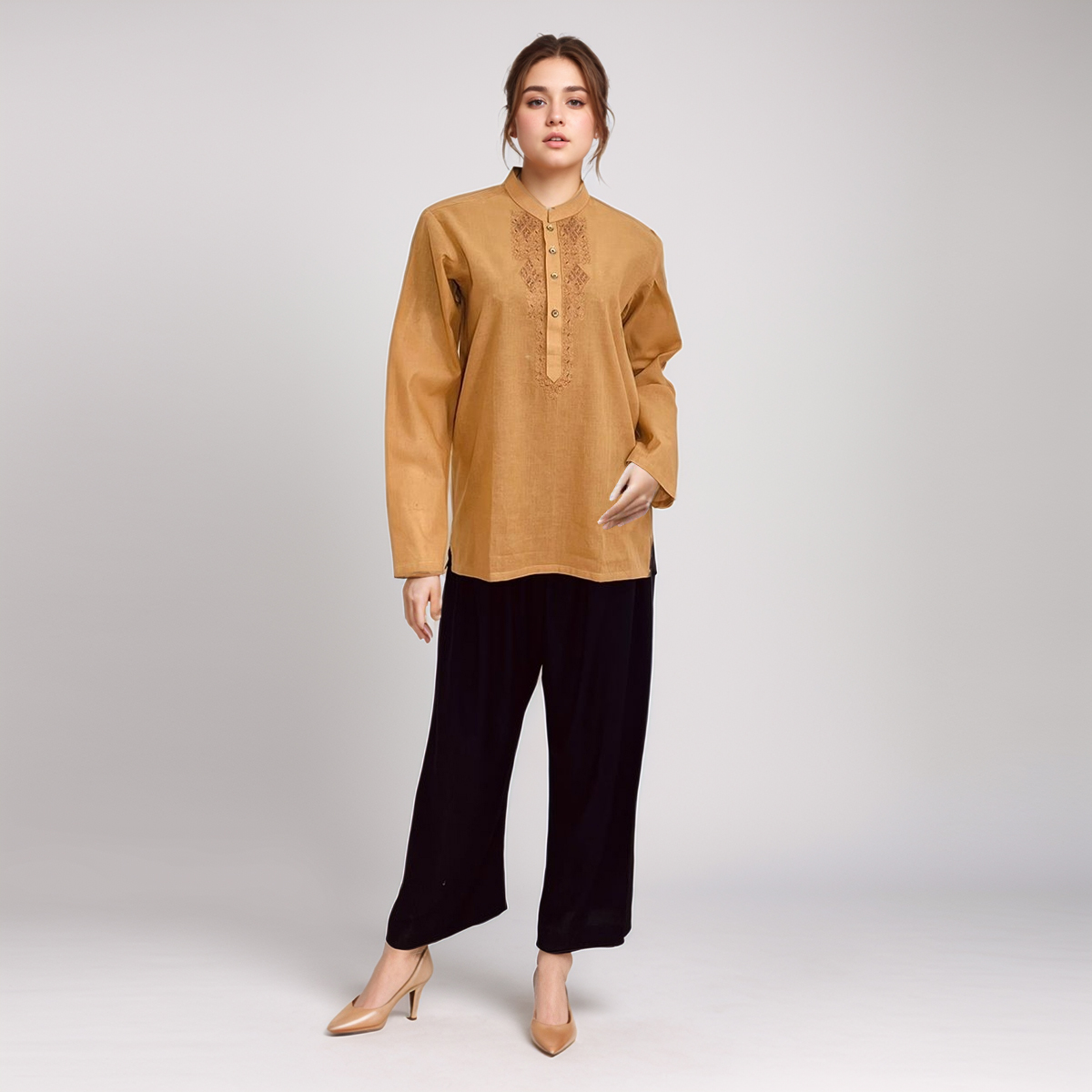 Introducing our Light Camel Color Embroidered Wholesale Khaddar Short Kurti, a perfect blend of style and comfort. Made from high-quality cotton/khaddar fabric, this kurti is soft and breathable, making it ideal for everyday wear. The beautiful embroidery over the neckline adds an elegant touch, enhancing your look effortlessly.