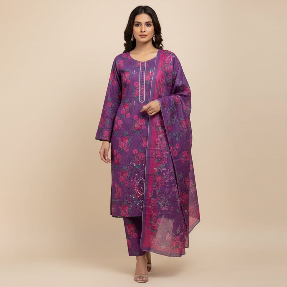 The Magenta Embroidered Wholesale Sana Safinaz Replica Suit is designed for women who appreciate luxury-inspired fashion with timeless elegance. Crafted as a premium quality embroidered 3-piece stitched suit, this outfit features a striking magenta color that adds richness and sophistication to any wardrobe. The warm and comfortable dhanak fabric makes it an excellent choice for seasonal wear while maintaining a graceful fall and structured look.