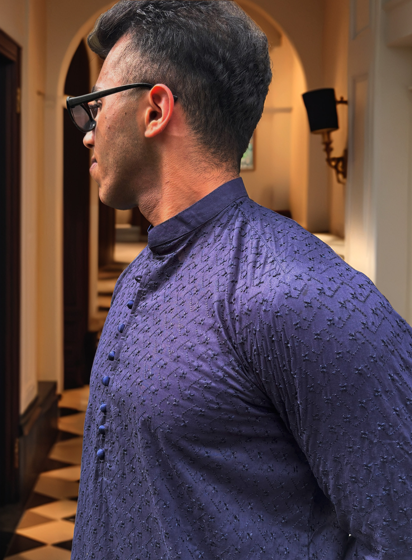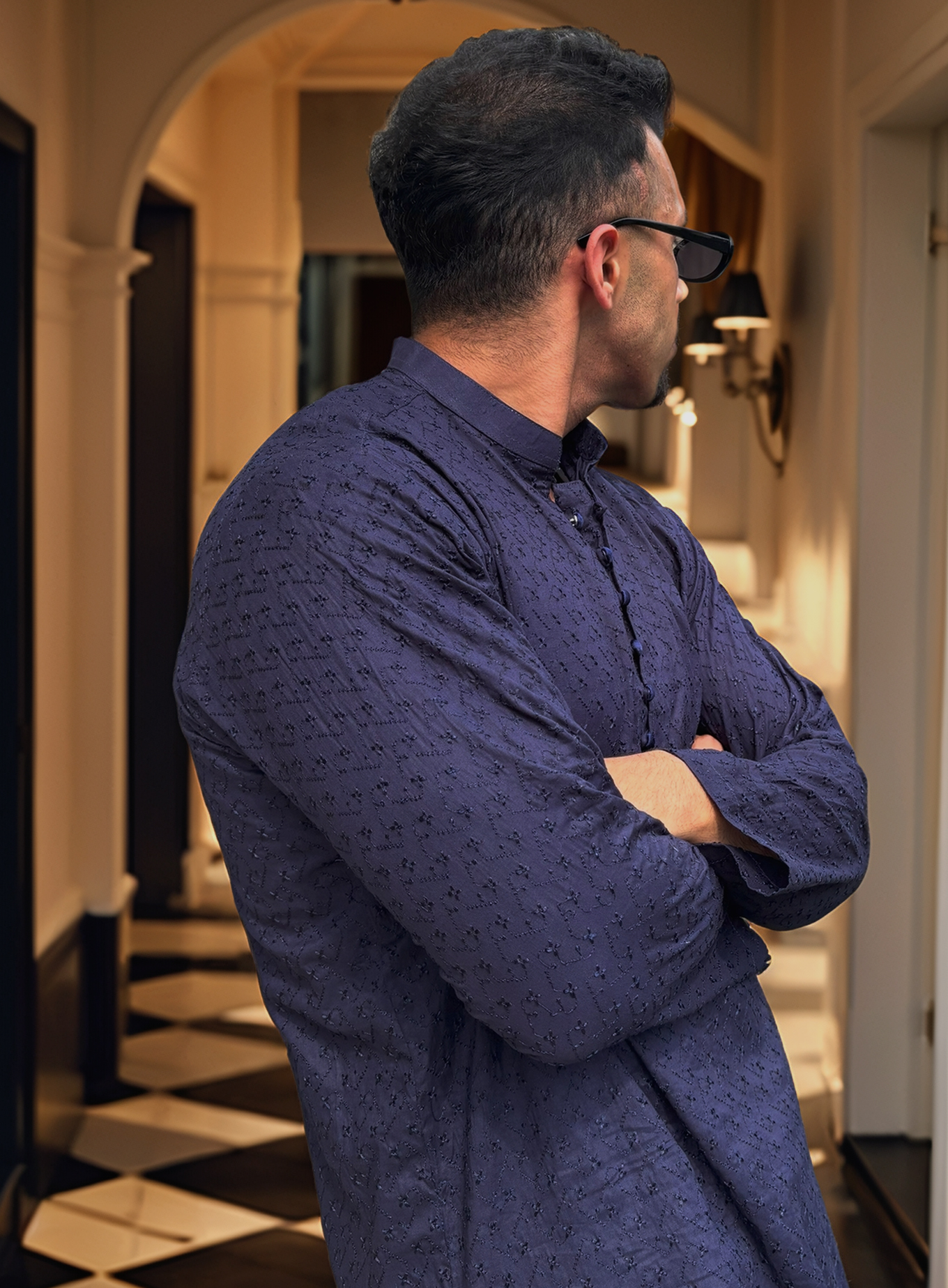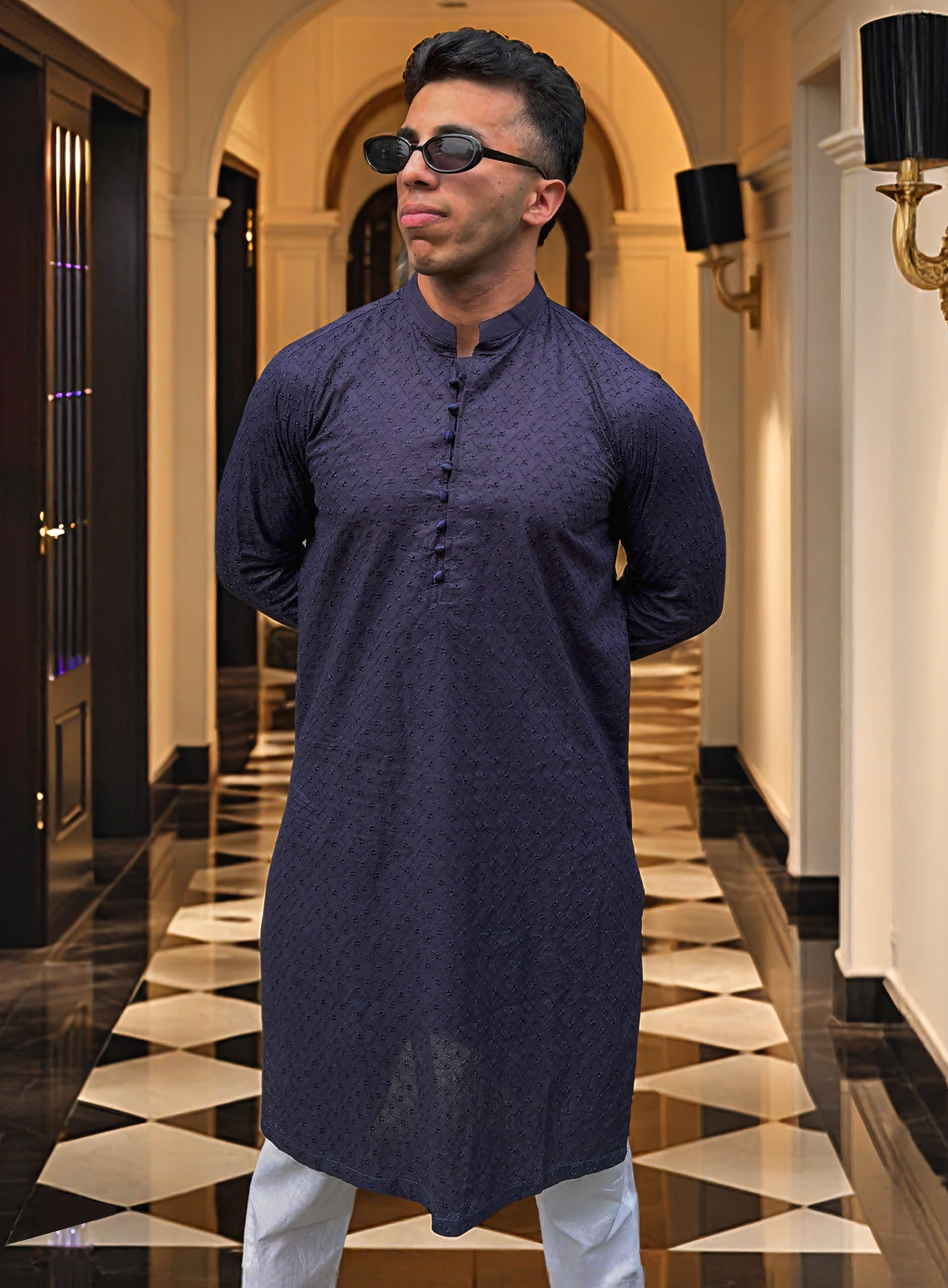 The Navy Blue Men’s Kurta with Chikankari Embroidery is a perfect blend of tradition and sophistication. Its deep navy shade adds a refined charm, while the fine chikankari work highlights its graceful design. This kurta is an ideal choice for festive occasions, family gatherings, and formal events, giving you a polished yet comfortable look.