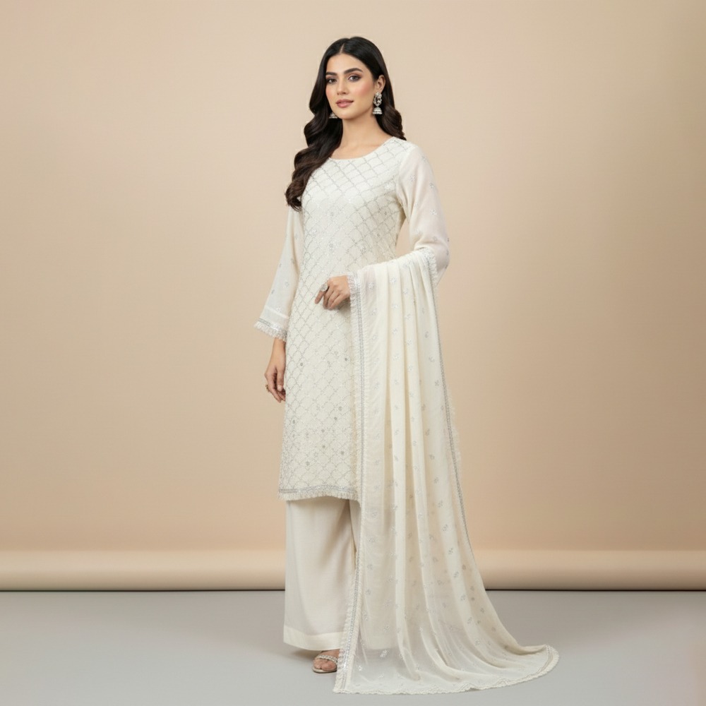 Perfect for boutiques and retailers, the Off-White Pakistani Chiffon Suit Wholesale delivers premium quality, intricate detailing, and strong market appeal for customers looking for elegant and versatile formal wear.