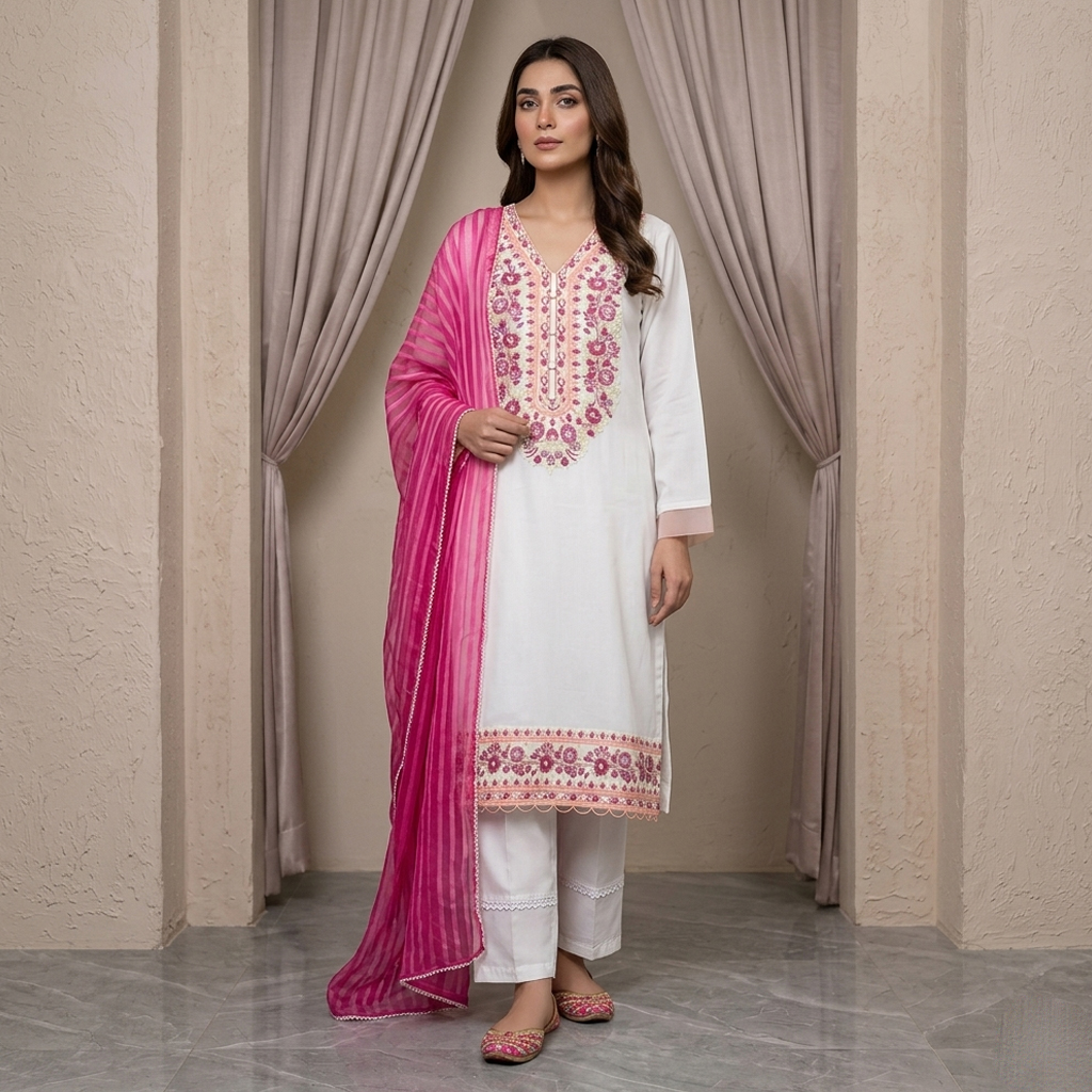 The Off-White Wholesale stitched linen collections bring together timeless elegance and statement design, making them a must-have for premium boutique selections. Crafted in a pristine off-white/cream base, this 3-piece suit is enhanced with delicate pink and mauve floral embroidery that adds a soft yet luxurious touch. The premium Banadora linen fabric ensures a breathable, structured feel, ideal for festive daytime wear and seasonal collections.