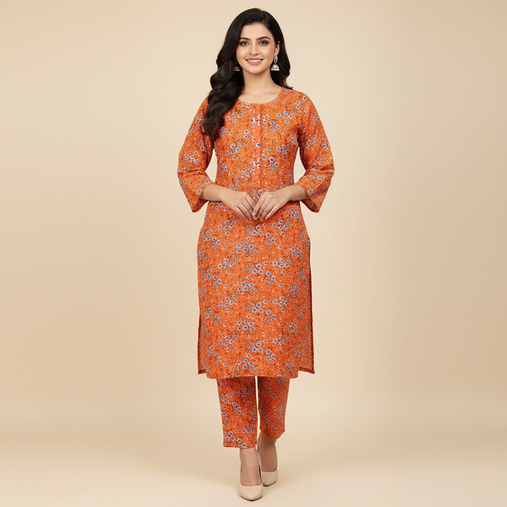 Made from high-quality poly cotton fabric, this outfit offers a perfect balance of softness, breathability, and durability. The lightweight feel ensures comfort throughout the day, while the fabric remains easy to maintain for regular use. The flowery printed design adds a graceful feminine touch, enhanced further by a trendy neckline that gives the suit a modern appeal.