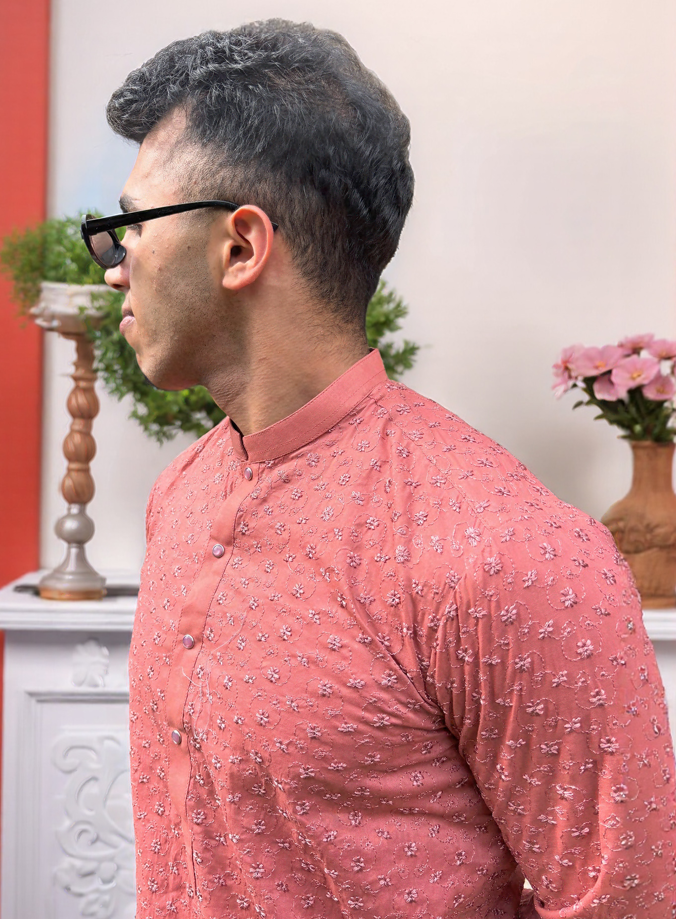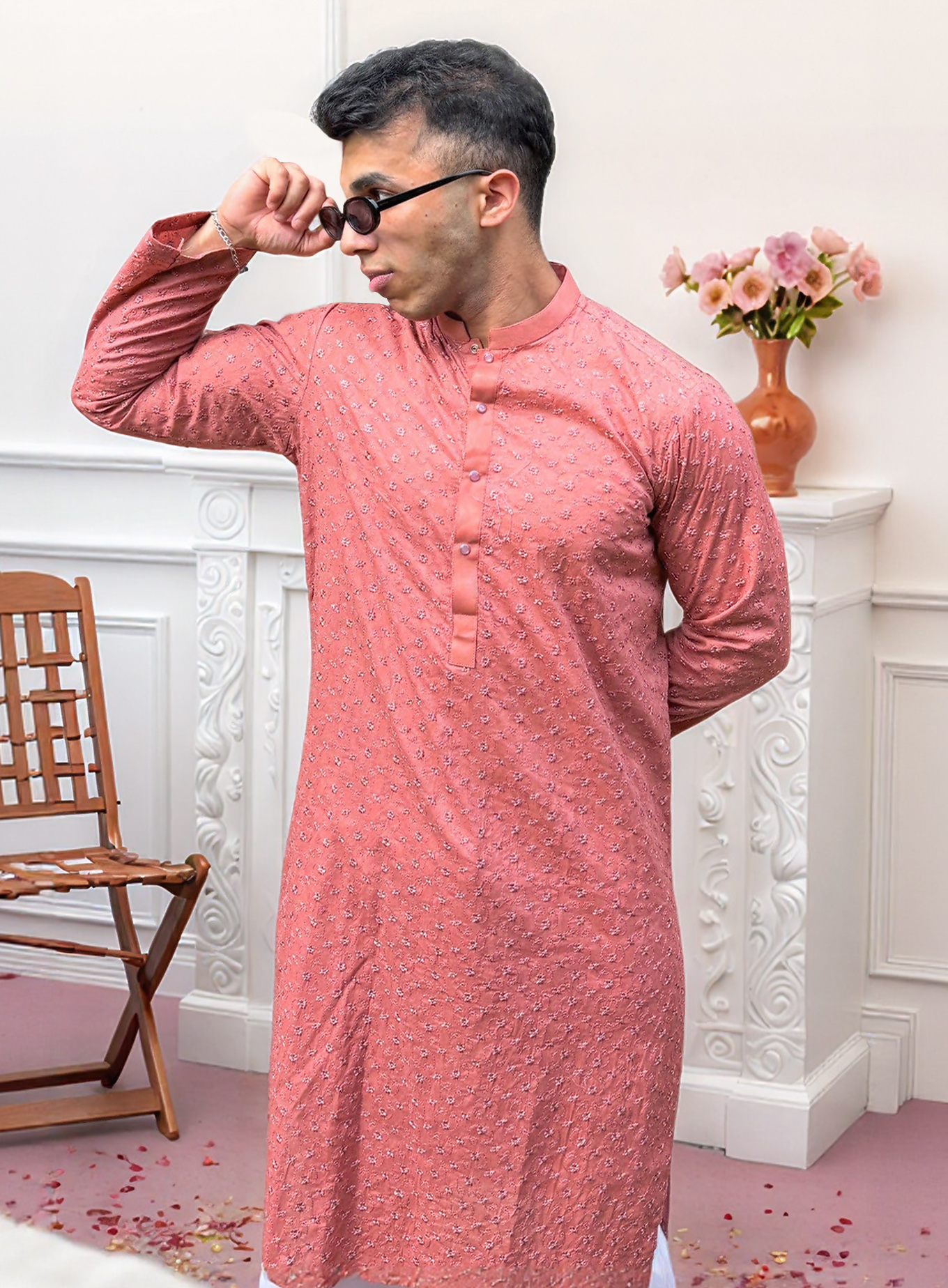 The Pink Pakistani Chikankari Kurta for Men blends tradition with a modern color twist. Its soft pink shade gives a refreshing look, while the detailed chikankari embroidery highlights timeless craftsmanship. Perfect for festive gatherings, weddings, or cultural occasions, this kurta adds charm and elegance to any wardrobe.