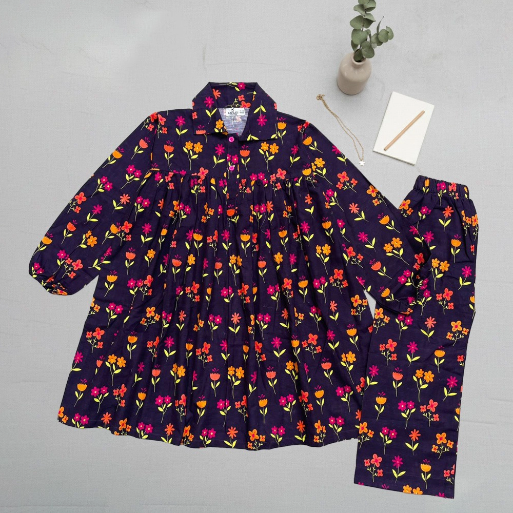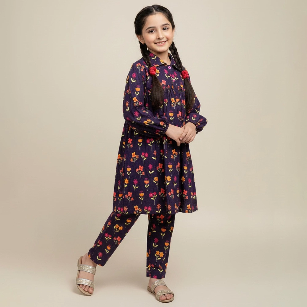 The Purple Girls Casual Wear Wholesale Floral Print Suit brings together comfort, charm, and everyday style in one adorable outfit. Made from 100% soft cotton, this suit ensures breathable comfort throughout the day, making it perfect for school, playdates, and casual outings. The vibrant multicolor floral print adds a lively touch, giving the outfit a bright and cheerful look that young girls love.