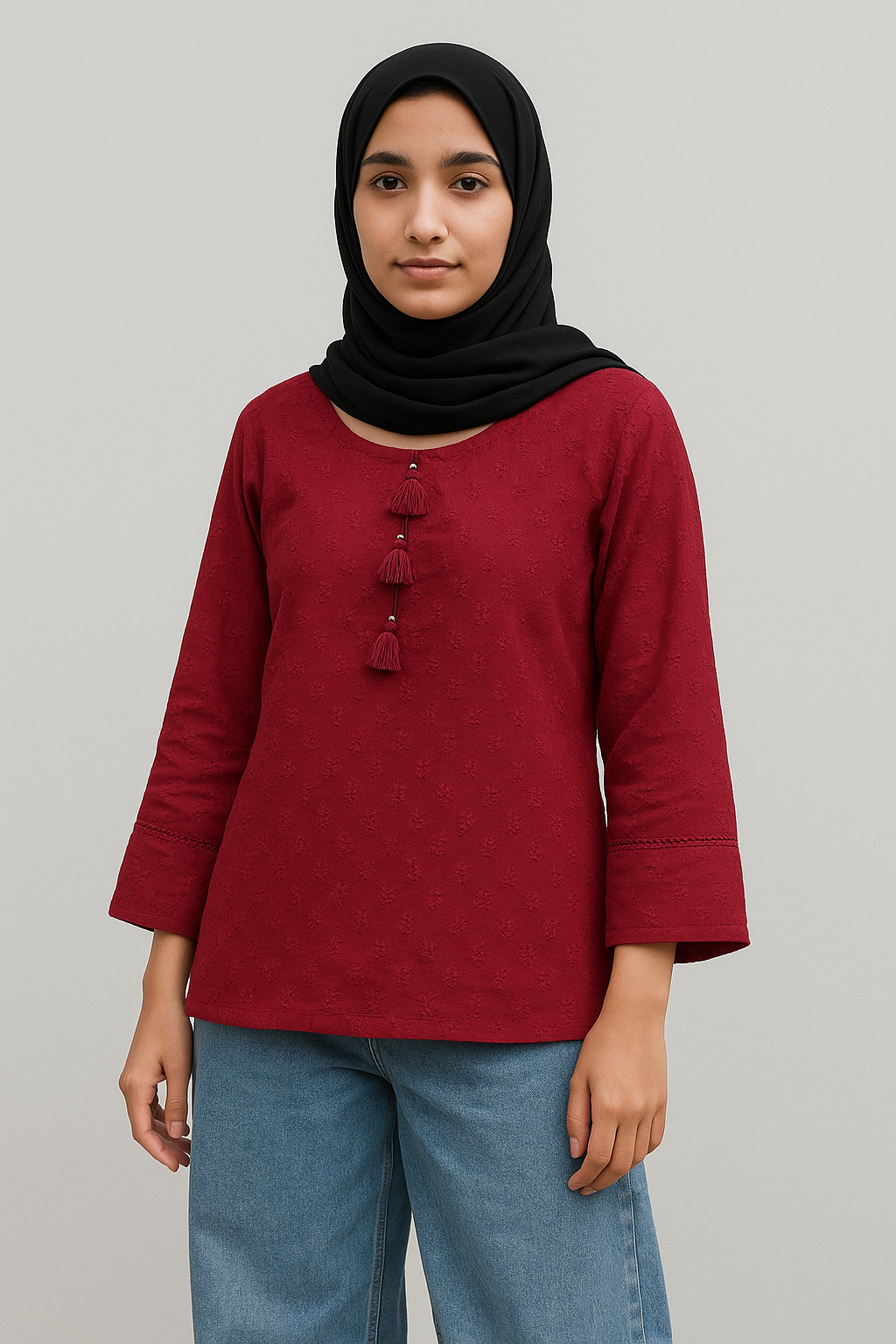 Featuring a short length with a trendy neckline, this kurti is finished with delicate lace embellishments and playful tassel details for a chic touch. Whether paired with jeans for a casual day out or trousers for a semi-formal event, it creates a versatile look that stands out. Available in all sizes, this Chikankari cotton kurti is a must-have for UK customers who value style and comfort.
