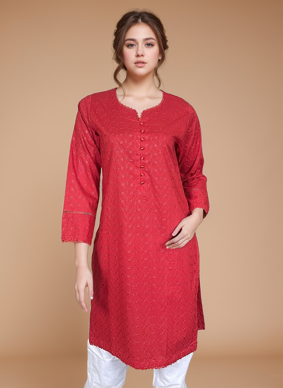 Step into elegance with this Ladies Chikankari embroidered kurti in a rich red color. Designed with a trendy neckline, this kurti blends traditional embroidery with a modern touch, making it perfect for both casual wear and festive occasions.