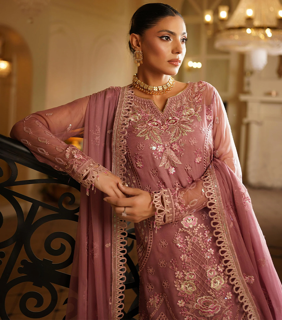 Perfect for boutiques and wholesale buyers, the Rose pink Pakistani Chiffon Suit Wholesale offers high-quality craftsmanship, timeless style, and strong market demand for special occasion wear.