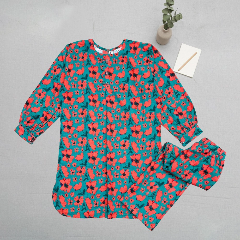 The Teal Color Vibrant Floral Girls Casual Wear Wholesale Dress brings comfort, color, and charm together in one stylish outfit. Designed with a beautiful teal base and eye-catching coral and pink floral prints, this dress delivers a lively and playful look perfect for girls of all ages. The soft, breathable cotton fabric ensures all-day comfort, making it a great choice for everyday use as well as special occasions.