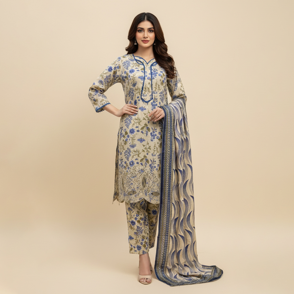 The kameez features delicate floral and botanical motifs in shades of blue and soft green, bringing a touch of freshness and femininity. Its cutwork appliqué border on the daman adds an artisanal finish that highlights intricate craftsmanship. Paired with matching beige trousers adorned with all-over floral prints, the outfit maintains a harmonious balance of texture and tone. Completing the set is a contrasting dupatta in geometric and wave patterns, featuring hues of blue and beige that add modern flair to the traditional ensemble.