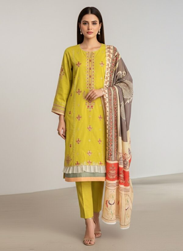 The Zoya Saffron Wholesale Stitched Ladies Lawn 3pc Dress (4pcs Set) brings a vibrant and elegant touch to seasonal wardrobes. Crafted in a rich saffron shade, this stitched lawn suit delivers both comfort and style, making it a perfect wholesale choice for summer and mid-season collections. The front and sleeves feature detailed embroidery that enhances the overall premium look, while the bead-worked neckline adds a graceful sparkle.