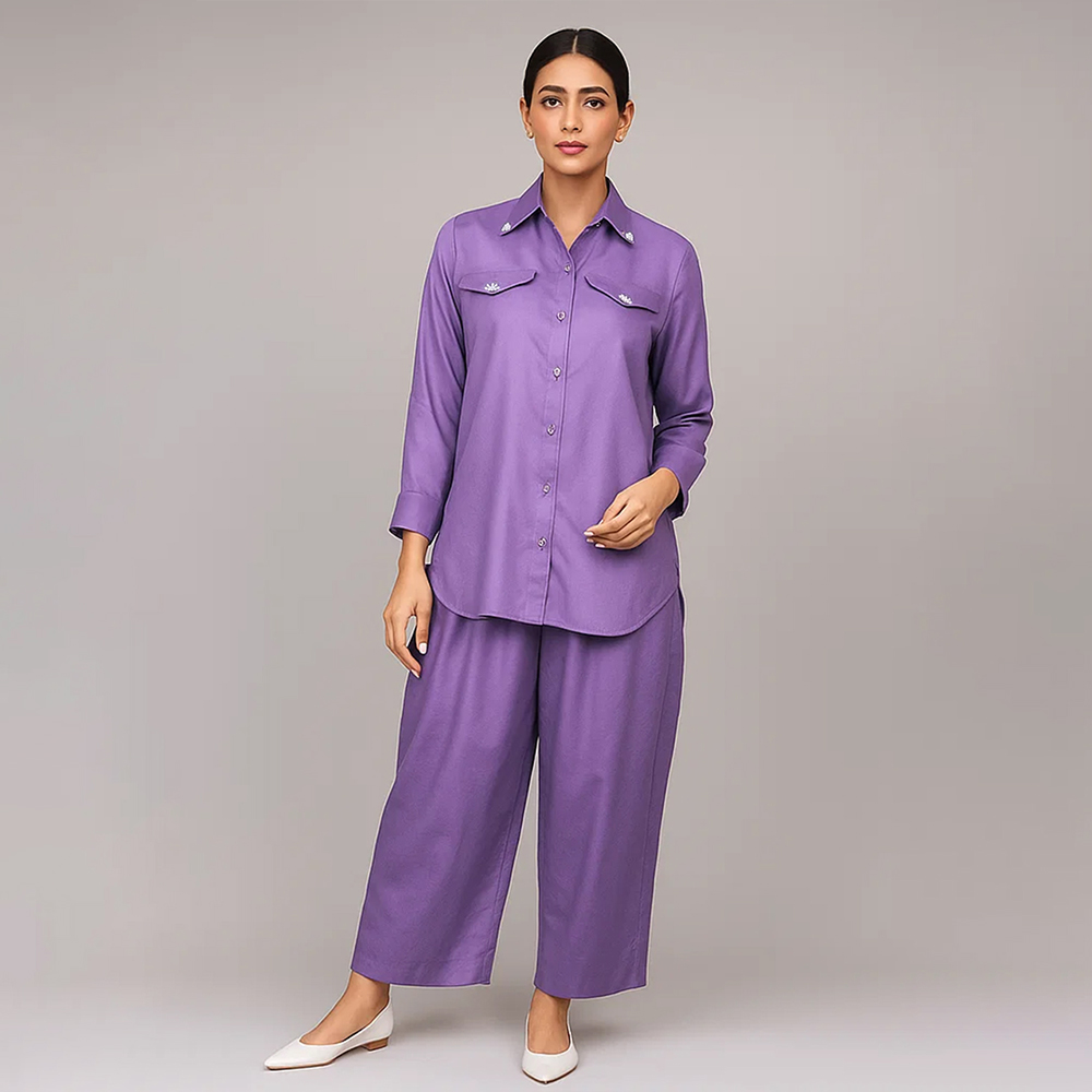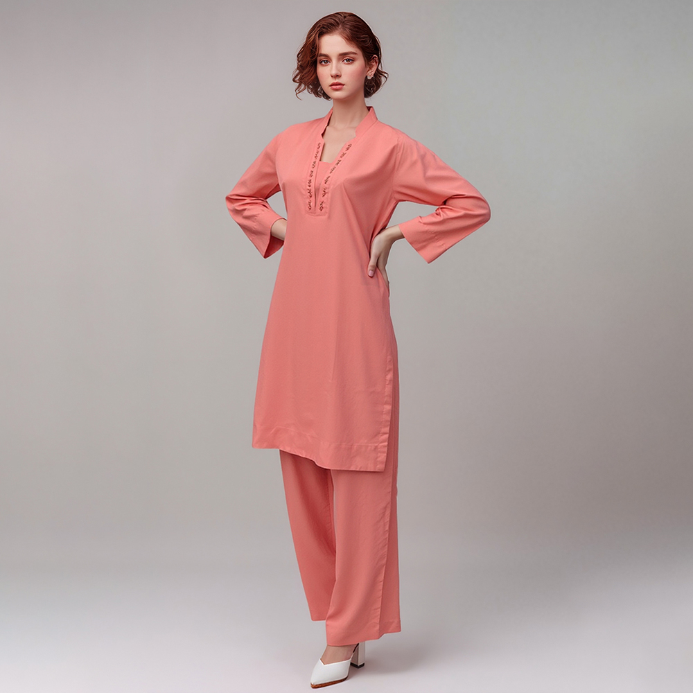 Our wholesale Pakistani co-ord sets come in various trendy styles and designs. We offer long-length shirts paired with regular pencil trousers, which are popular in both local and international markets. Additionally, we provide short-length co-ord sets with plazos at the bottom. Our designs feature trendy and attractive solid colors to appeal to a wide audience.